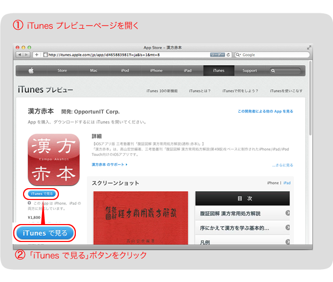 ページが開くと iTunes が起動して「漢方赤本」のページが開きます。
