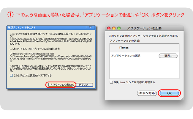 iTunesを起動するという画面が開いた場合は、「iTunesを起動する」や「OK」ボタンをクリックします。