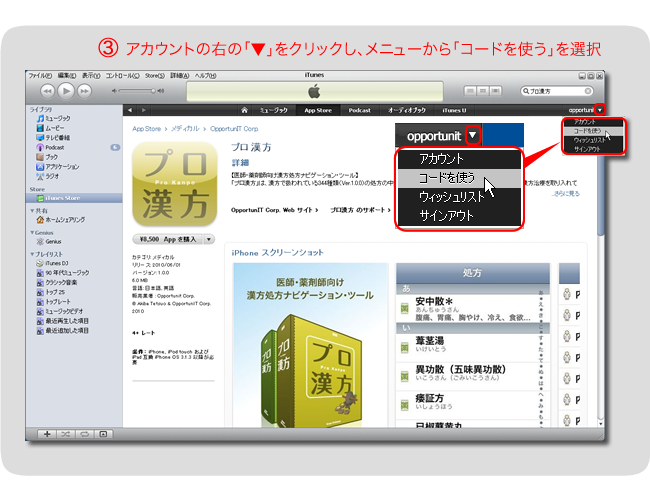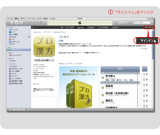 ※iTunesを起動していない場合は、先に プロ漢方の購入方法の手順1に従い、ソフトを起動してください