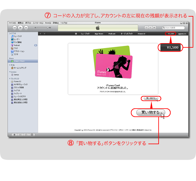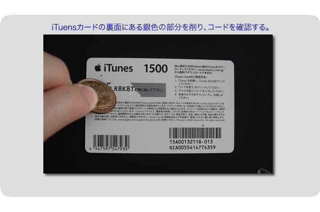 はじめに、iTunes カードを電器量販店やセブンイレブンなどで購入します。カードの裏面にある銀色の部分を削り、コードを確認します。