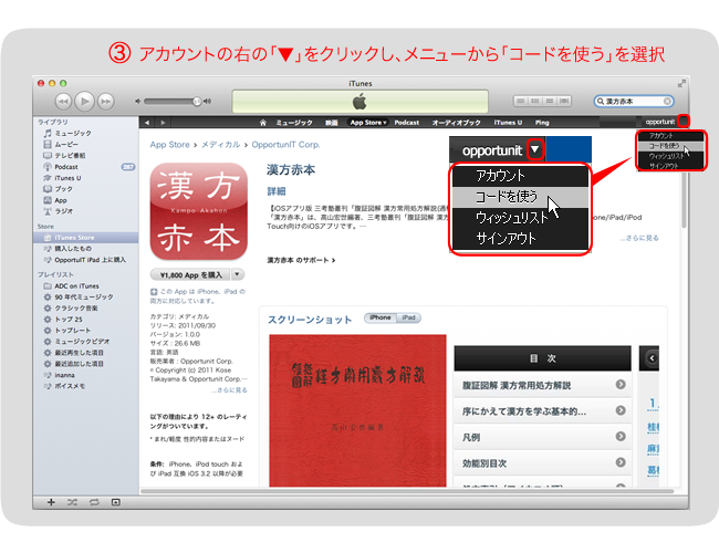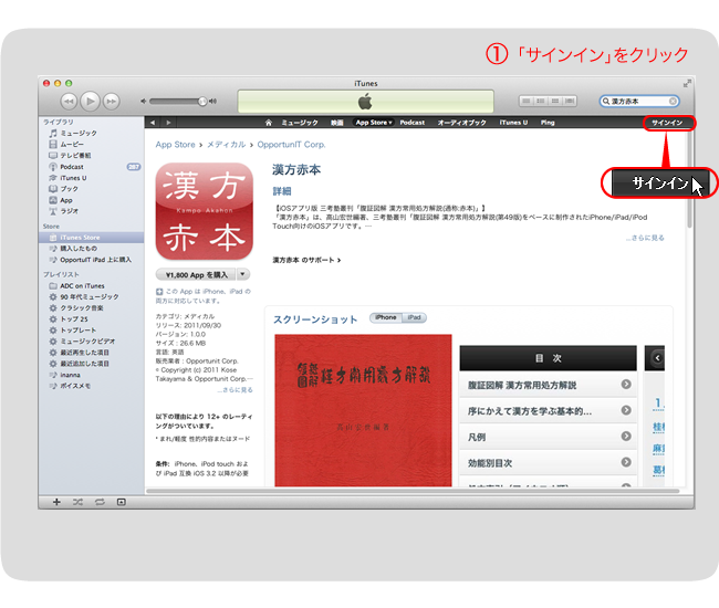 ※iTunesを起動していない場合は、先に 漢方赤本の購入方法の手順1に従い、ソフトを起動してください