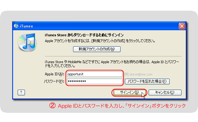 (1) iTunesにサインインします。画面右上の「サインイン」をクリックします。