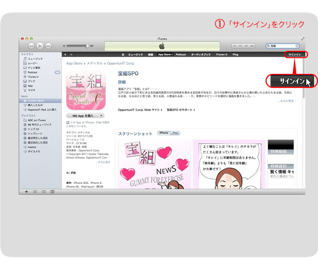 ※iTunesを起動していない場合は、先に 「宝組**」の購入方法の手順1に従い、ソフトを起動してください
