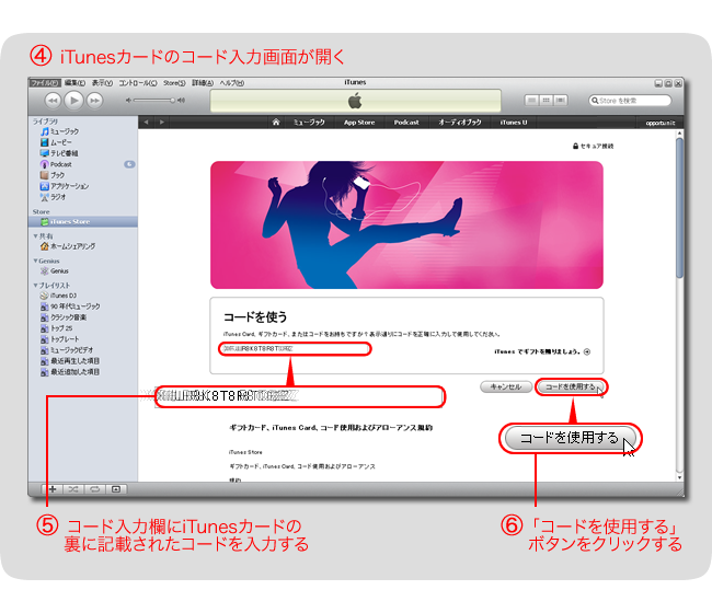 (5) コードの入力欄に、iTunesカードの裏面に記載されたコードを入力します。