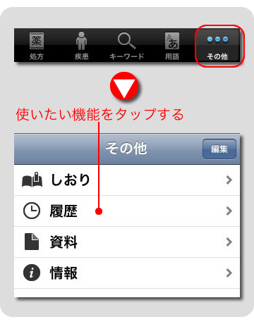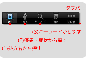 処方の調べ方には3つの方法があります。目的にあわせて、画面下にあるタブバーのボタンをタップします。