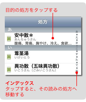 50音順に並んだ 344 種類の処方名の一覧から、目的の処方を探します。