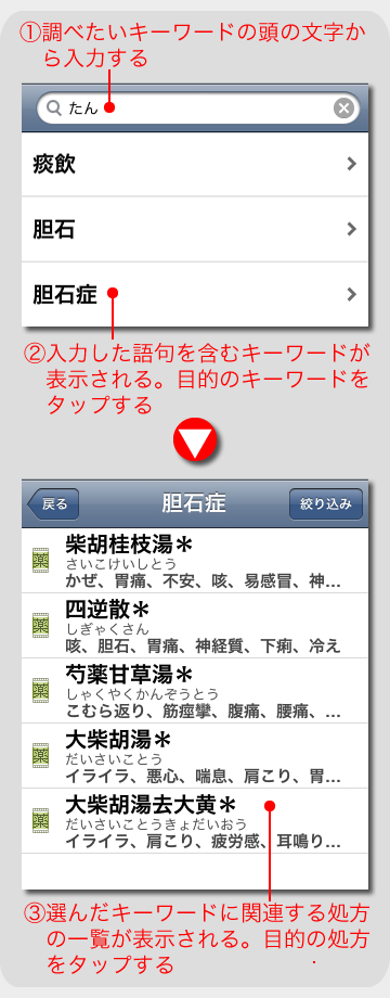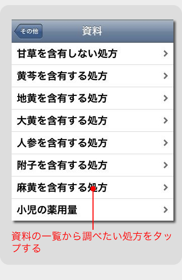 漢方の関連用語を調べます。 50 音順に並んだ用語一覧から調べたい用語をタップします。用語の解説ページが表示されます。
