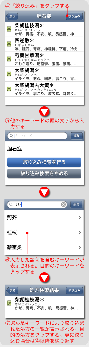 一つのキーワードに関連する処方の一覧を他のキーワードで絞り込みます。