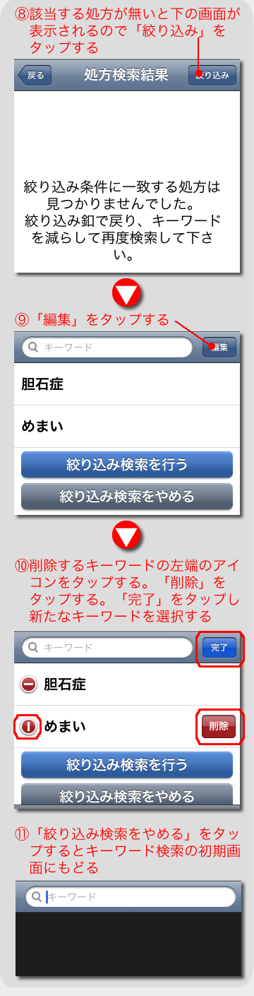 絞り込みの結果、該当する処方が無い、絞り込みに使うキーワードを変更する等の場合は、キーワードの編集機能を使用します。