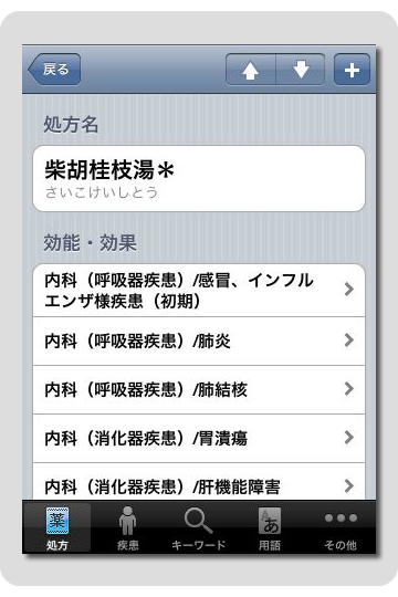 検索結果の処方名の一覧から目的の処方名をタップすると、処方の詳細解説ページが表示されます。