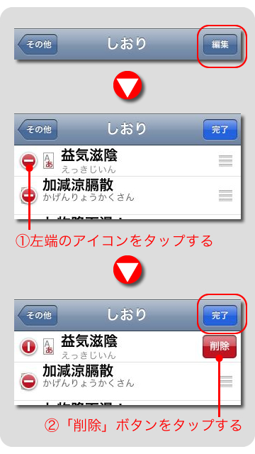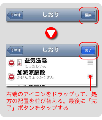 しおりの登録順の並び替えや、不要な処方をしおりから削除することができます。