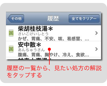 過去に閲覧した処方の一覧を表示する機能です。一覧から見たい処方をタップすることで、解説ページを手早く開くことができます。