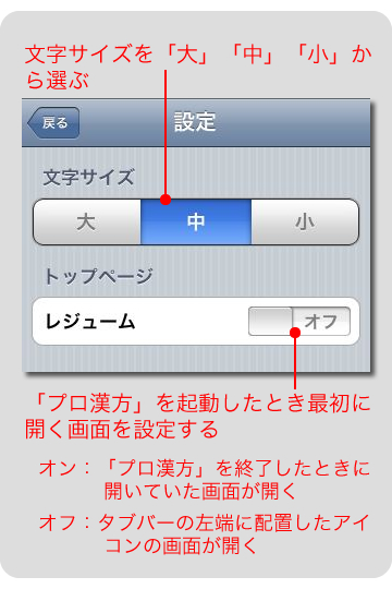 画面の文字サイズの変更や、アプリの起動時に開く画面の設定ができます。